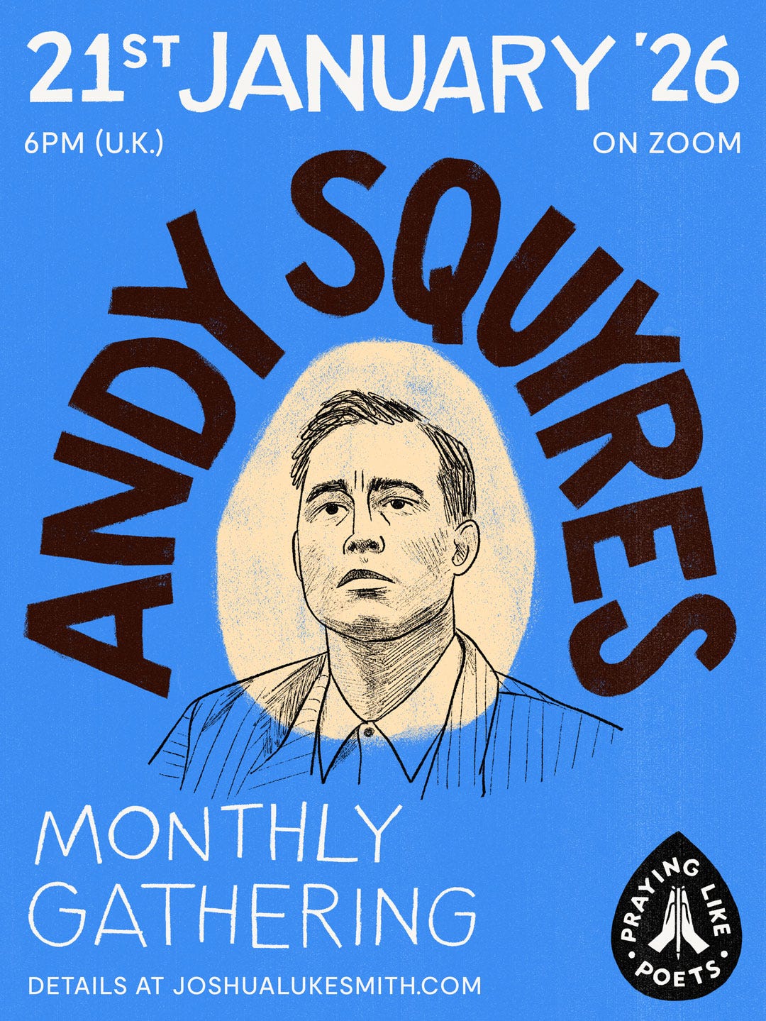 We also have our monthly Praying Like Poets Huddle on the 21st, with a very special guest: Andy Squyres . If you don’t know Andy, I think of him as a priest in the wild — he’s an exceptional poet and songwriter, a man with expensive words and much to glean from.